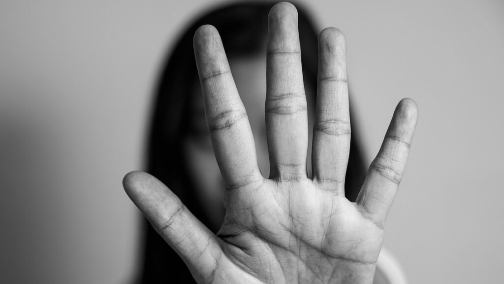 woman raised her hand for dissuade, campaign stop violence against women. Asian woman raised her hand for dissuade with copy space, black and white color (woman raised her hand for dissuade, campaign stop violence against women. Asian woman raised her