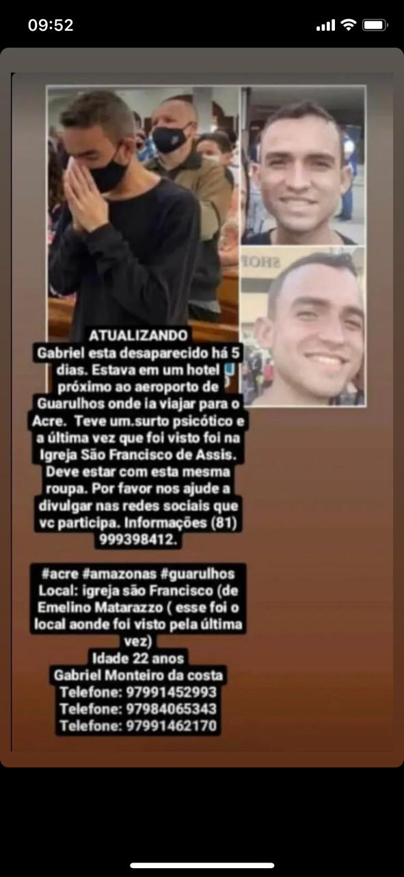 Gabriel havia ido morar em São Paulo, para estudar o curso de Direito, e no dia 5 de dezembro, teria sofrido o surto, achando que estava sendo perseguido por pessoas que queriam tirar sua vida. Familiares e amigos do jovem utilizam as redes sociais em busca do paradeiro do rapaz.