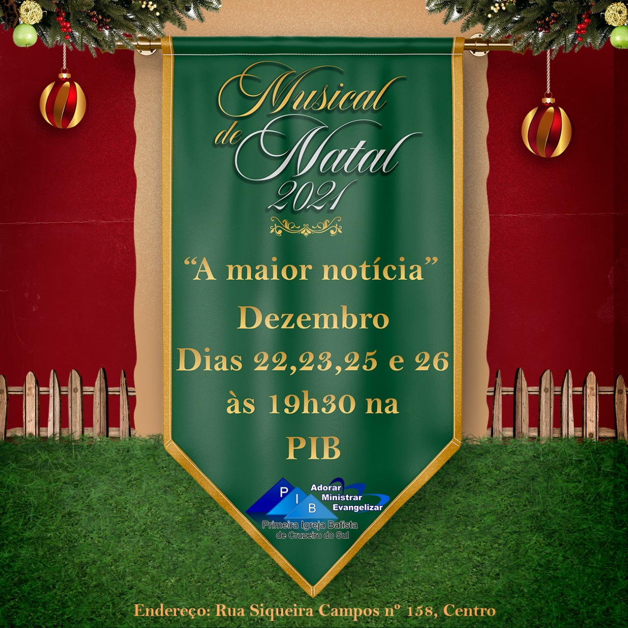 O musical ocorrerá nos dias 22, 23, 25 e 26 de dezembro, às 19h30, na PIB, que fica localizada no centro da cidade, rua Siqueira Campos, n° 158.
