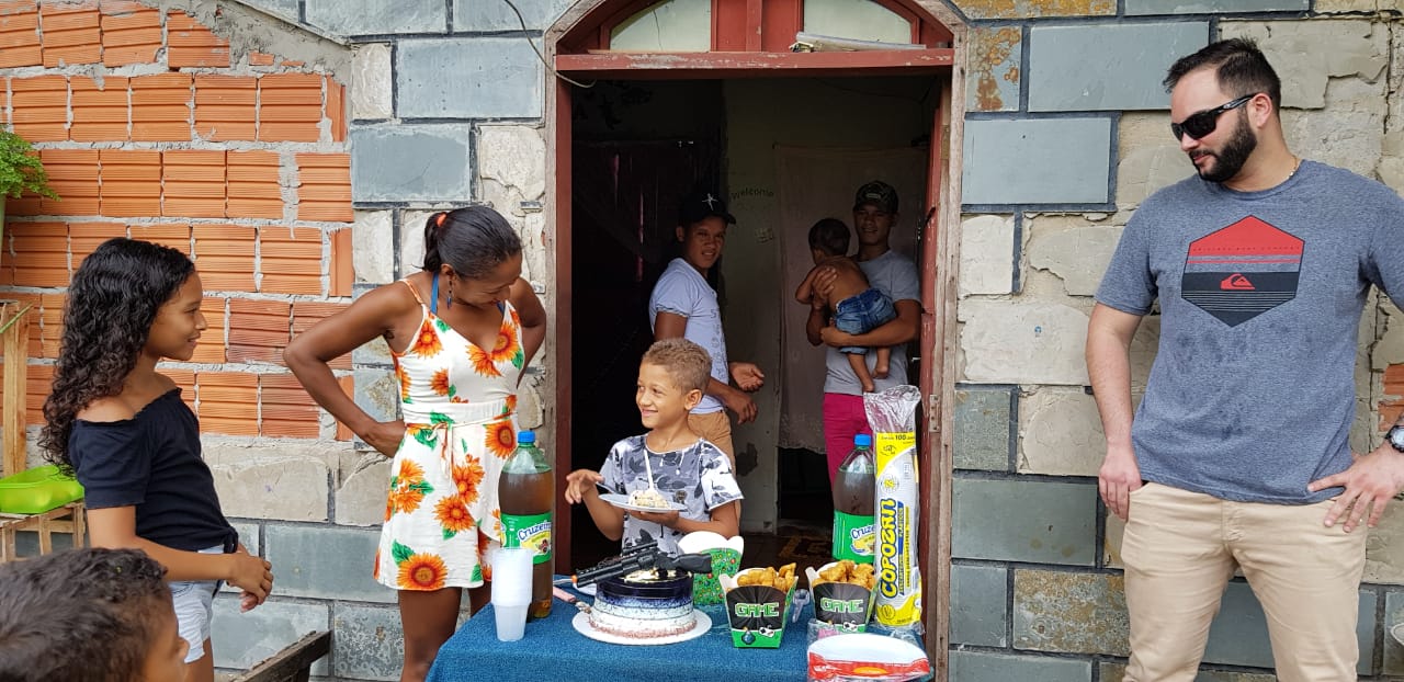 Os agentes de segurança levaram sacolões, uma botija de gás, um bolo e uma bola para o aniversariante e sua família.
