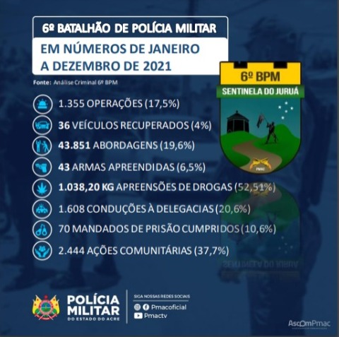 O 6° Batalhão da Polícia Militar no Vale do Juruá, emitiu um relatório das ações realizadas durante os meses de janeiro a dezembro do ano de 2021. Os números foram divulgados nesta segunda-feira (10).