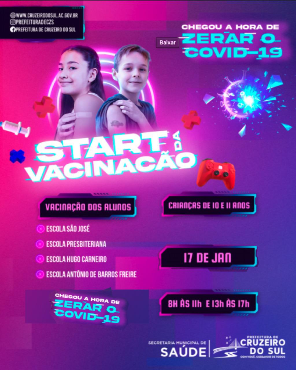 Nesta segunda-feira (17), a prefeitura de Cruzeiro do Sul, através da Secretaria Municipal de Saúde, iniciará a campanha Start da Vacinação, tendo como público alvo as crianças de 10 e 11 anos de idade.