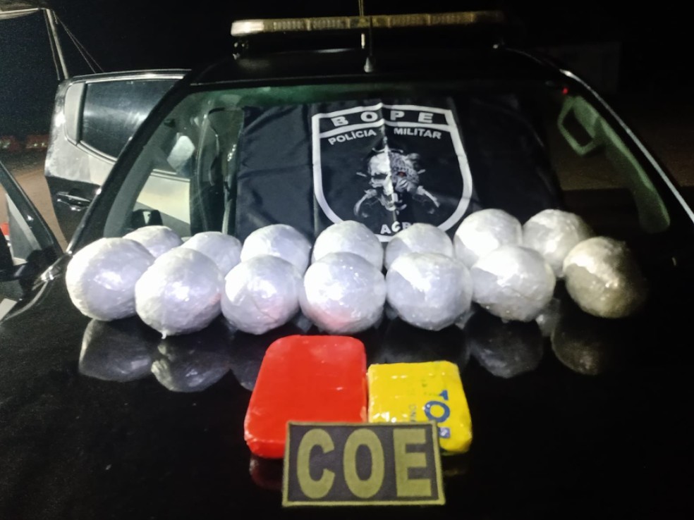 Ação ocorreu na madrugada desta segunda-feira (3), no trevo de Senador Guiomard, no interior do Acre, durante Operação Vigia. Ao todo, eram transportados a quantia de 8,3 quilos de skunk e mais 1,6 quilo de cocaína.