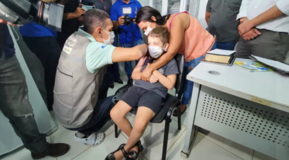 A primeira criança a receber a vacina foi Rafael Miranda, de 8 anos. Kerlly Santos Miranda Costa, mãe do menino, disse que o filho é autista tem outras comorbidades. Ela conta que estava ansiosa por esse momento no qual ele receberia a vacina. “Estava ansiosa para vacinar, deixar meu filho protegido. Até porque ele tem algumas comorbidades, então a imunidade dele é muito baixa”, disse.