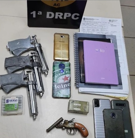 Na residência do nacional A. L. G., durante a ação policial, foi possível apreender uma arma de fogo (sem registro), do tipo “garrucha”, calibre .22, e uma caixinha de munições contendo 12 munições, .22, intactas.