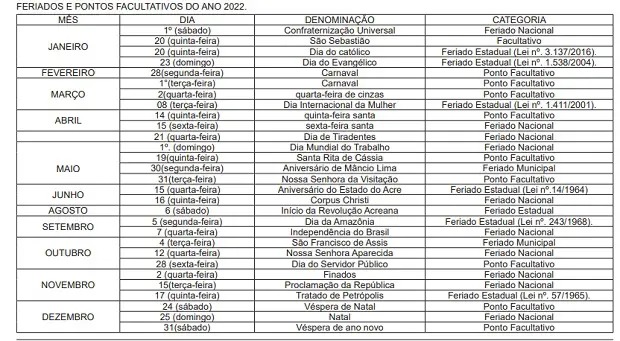 O prefeito de Mâncio Lima, Isaac Lima, publicou na edição do Diário Oficial do Acre desta quinta-feira (20), o decreto nº 03/2022, que cria um calendário com 29 dias de feriados e pontos facultativos no ano 2022 no município.