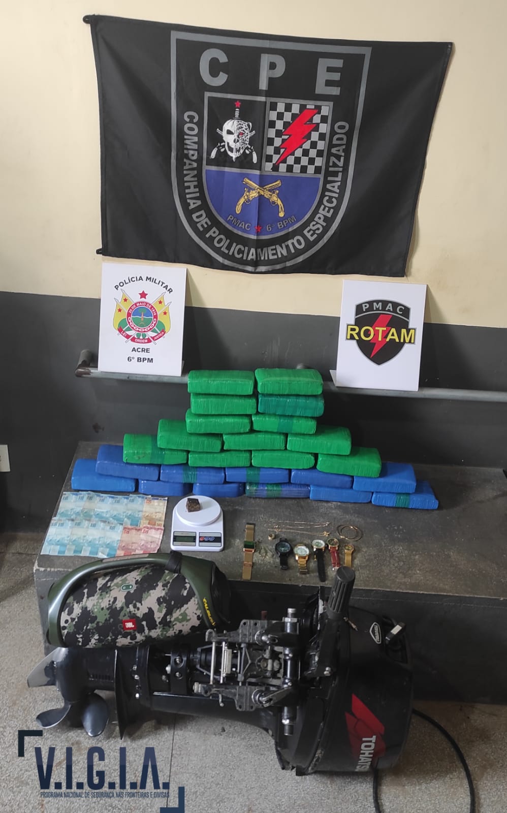 Durante a busca na casa do suspeito, foi encontrado 22,55 quilos de drogas, 2,03 kg de oxidado de cocaína, 6 relógios, uma caixa de som JBL, 1 balança de precisão e um motor HP-13. O material foi apreendido causando um prejuízo de R$146.350,00 ao mundo do crime.