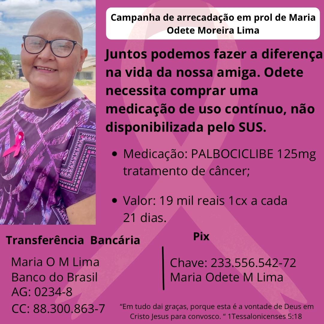 Para ajudar na compra do medicamento, basta realizar um Pix de qualquer valor para o CPF 233.556.542-72, Maria Odete Moreira Lima ou transferência bancária, bando do Brasil, Agência 0234-8 conta corrente 88.300.863-7.