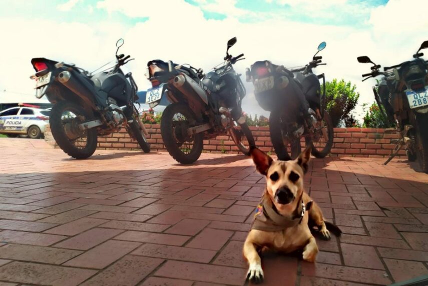 Cheia de garbo, exibindo sua bandana cáqui e seu coldre preto (montagem), a cadela Mucurinha nem de longe se parece com o animalzinho magrelo, sujo e debilitado que se aproximou do quartel do 2º Batalhão da Polícia Militar do Acre (2º BPM/PMAC), que temporariamente funciona no Estádio Arena da Floresta, em meados de outubro de 2021.