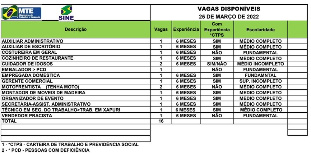 O Sistema Nacional de Emprego do Acre (Sine) disponibiliza 16 vagas para diversas áreas nesta sexta-feira (24) em Rio Branco. O atendimento está sendo feito exclusivamente por telefone.