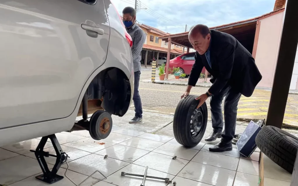 O prefeito de Rio Branco, Tião Bocalom, usou as redes sociais pra publicar um vídeo trocando o pneu de seu veículo logo pela manhã deste sábado (2).