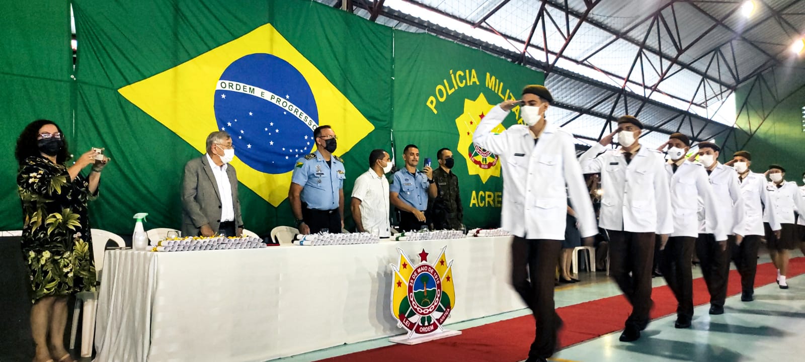 O comandante-geral da PMAC, coronel Paulo César Gomes, olhando para os alunos perfilados, enalteceu o momento para a vida dos jovens e para a comunidade acreana: “Eu, vendo os senhores aí em forma, vislumbro certamente no futuro novos engenheiros, advogados, médicos e, inclusive, policiais militares que contribuirão positivamente com o desenvolvimento do nosso estado. Então, parabéns a todos vocês”.