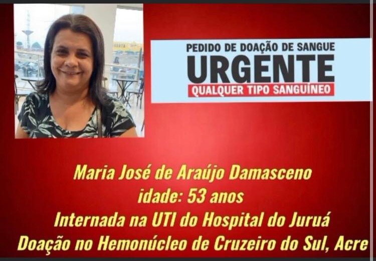 Os familiares e amigos de Maria José de Araújo Damasceno de 53 anos de idade, estão realizando uma campanha nas redes sociais para arrecadação de sangue. Maria está internada na Unidade de Terapia Intensiva (UTI), do Hospital Regional do Juruá, em Cruzeiro do Sul.
