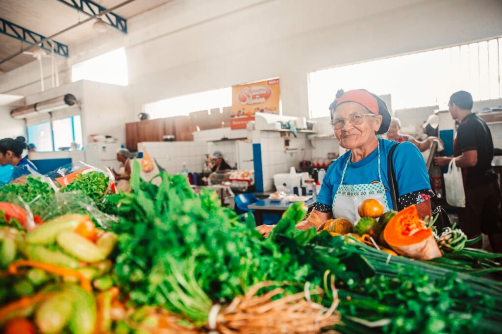 Nazaré Aguiar, conhecida pelos clientes como “Vozinha”, trabalha há 40 anos com a venda de verduras e outros produtos nos mercados de Cruzeiro do Sul.