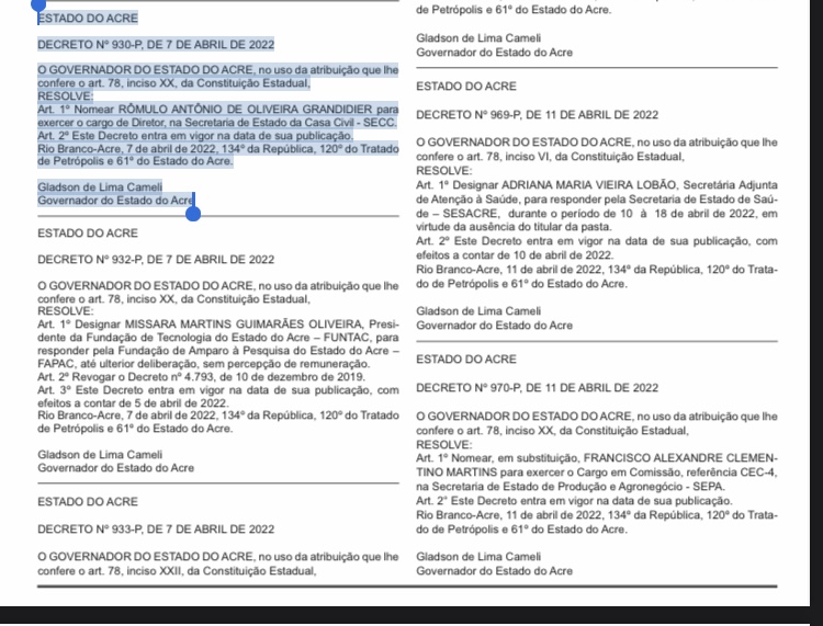 O Diário Oficial desta terça-feira (12) traz, pelo menos, seis nomeações e cinco exonerações. De acordo com a seção que trata dos despachos do governador Gladson Cameli, Rômulo Grandidier que deixou a secretaria mais importante do governo foi oficializado como novo diretor da Casa Civil.