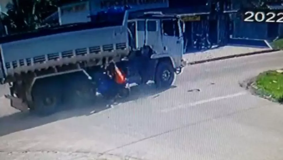 É possível ver ainda o momento em que o caminhão passa por cima da moto.