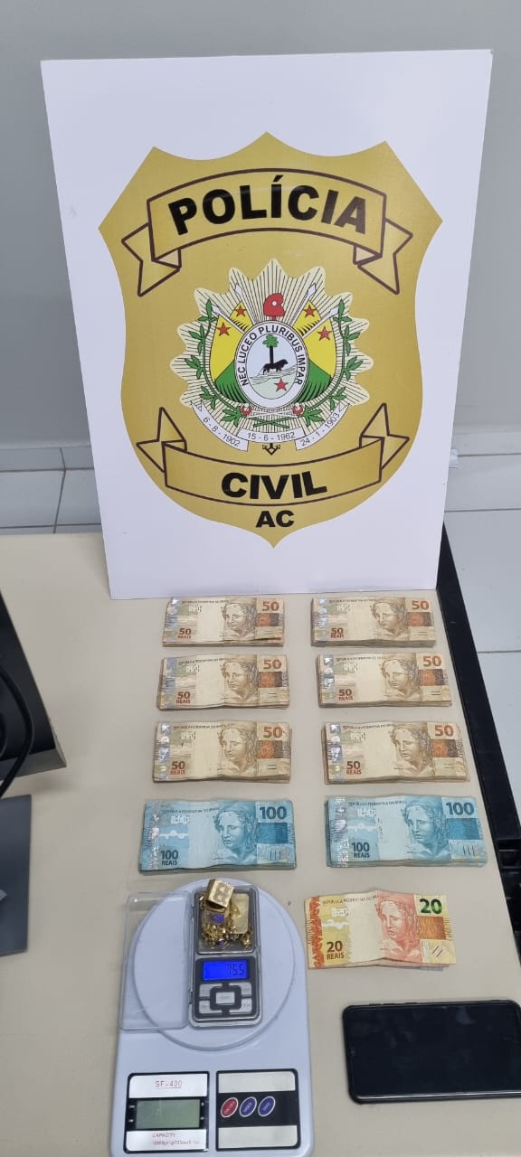 Foram apreendidos ainda, 01 celular Samsung A50 no valor de R$ 1.200, 03 automóveis (01 voyage prata, ano 2014/2015 de R$ 42.000; 01 fiat toro branca, ano 2016/2017 de R$ 90.000 e 01 ônix cinza, ano 2018/2018 de R$ 50.000), dentro de um deles foi encontrado R$ 20.832,00 em espécie e 75,5 centigramas de ouro equivalente a R$ 22.650,00.