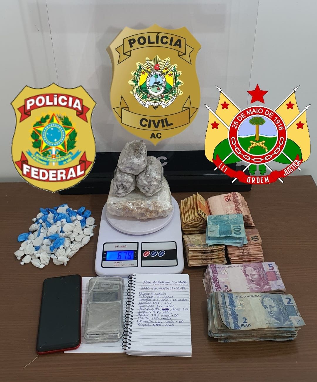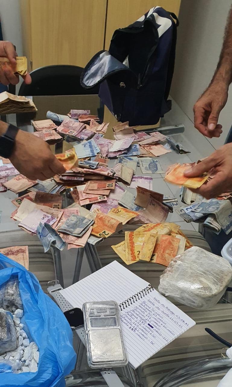 Foi realizado abordagem ao local ocasião em que o autor tentou empreender fuga, sendo frustrado pelo cerco policial onde foi flagrado de posse de 0,511kg (Quinhentos e onze gramas) de oxidado de cocaína; 0,169kg (cento e sessenta e nove gramas) de maconha; 0,035kg (trinta e cinco gramas) de cocaína e R$ 3.435,00 (três mil, quatrocentos e trinta e cinco reais) em espécie.