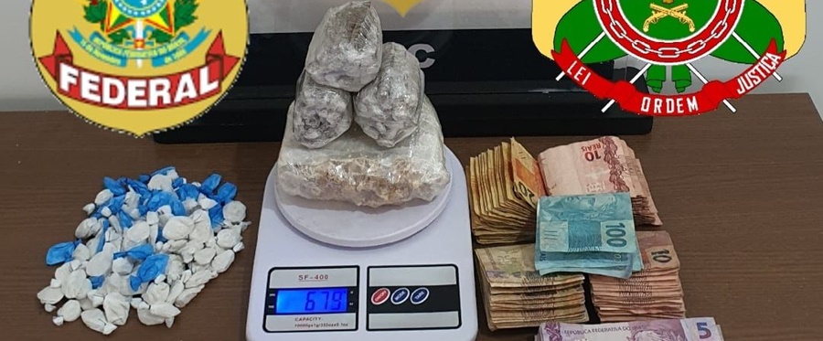 Foi realizado abordagem ao local ocasião em que o autor tentou empreender fuga, sendo frustrado pelo cerco policial onde foi flagrado de posse de 0,511kg (Quinhentos e onze gramas) de oxidado de cocaína; 0,169kg (cento e sessenta e nove gramas) de maconha; 0,035kg (trinta e cinco gramas) de cocaína e R$ 3.435,00 (três mil, quatrocentos e trinta e cinco reais) em espécie.