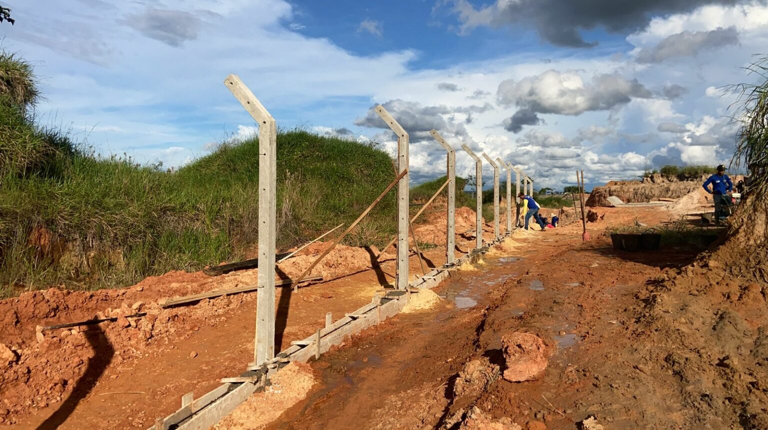 Equipe do Deracre trabalha na construção da cerca metálica ao redor da pista de pouso e decolagem. Foto: Ascom/Deracre