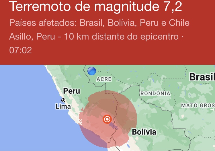 Moradores do município de Cruzeiro do Sul, no interior do Acre, sentiram um terremoto na manhã desta quinta-feira (26), que, de acordo com Serviço Geológico dos Estados Unidos (USGS), chegou à magnitude 7,2. Os indicadores mostram ainda que foi um tremor leve e pouco profundo, 10 km debaixo do solo.