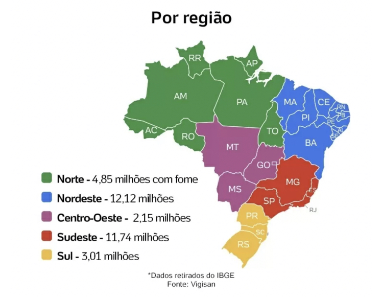 Proporcionalmente, a preocupação com o acesso a alimentos atinge maiores parcelas da população no Norte (71,6%) e no Nordeste (68%). Em números absolutos, o Nordeste registra mais pessoas com fome: são 12 milhões em situação de insegurança alimentar grave.