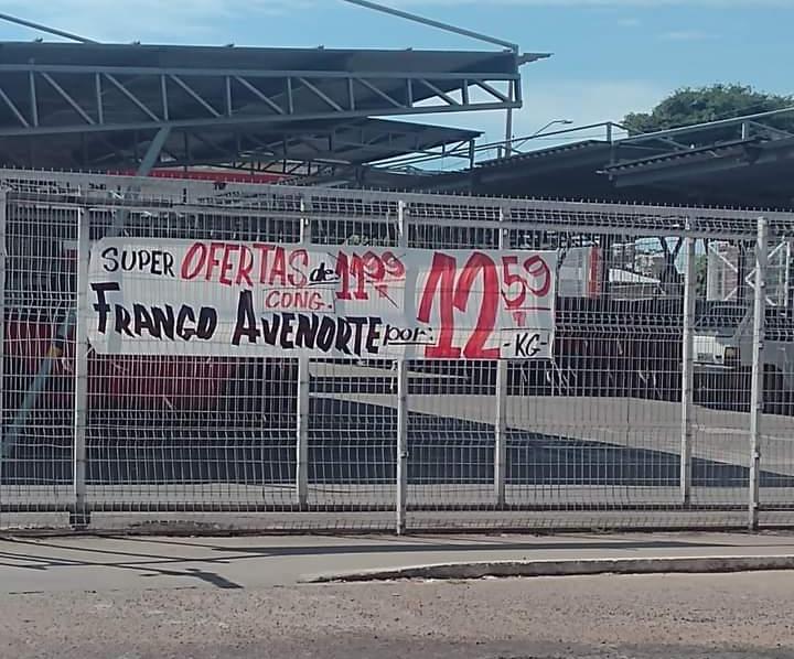 Tudo teve início quando os clientes perceberam que uma faixa fixada na grade que cerca o supermercado anunciava uma promoção de frango. Até aí tudo bem. Acontece que o produto estava sendo oferecido por um valor a mais do que o original.