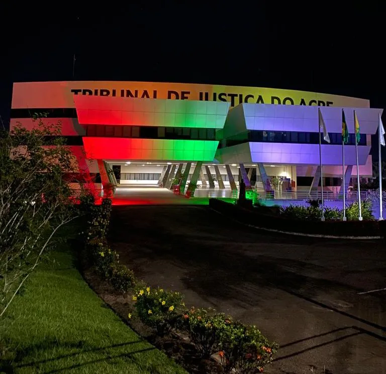 A sede administrativa do Tribunal de Justiça do Acre (TJAC) está iluminada com as cores do arco-íris em alusão ao Mês do Orgulho LGBTQIAP+, celebrado em junho.