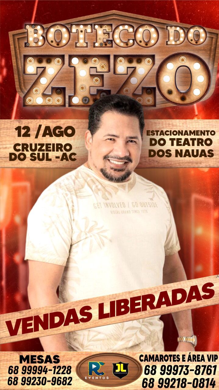O cantor Zezo Potiguar vai se apresentar no próximo dia 12 de agosto em Cruzeiro do Sul (AC), com seu novo show ‘Boteco do Zezo’. As vendas de ingressos foram liberadas pela organização do evento.