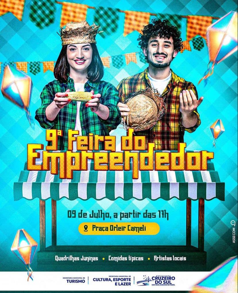 A 9° Feira do Empreendedor acontecerá neste sábado (09), na Praça Orleir Cameli, em Cruzeiro do Sul. O evento iniciará às 17hrs e terá a apresentação de quadrilhas juninas, artistas e artesanato locais, além de comidas típicas.