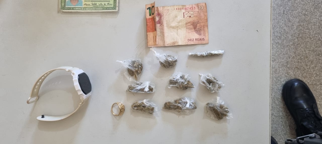 Ao chegar no local, a guarnição avistou o suspeito, após ser realizado a abordagem e revista pessoal, foram encontrados, sete papelotes de substância aparentando ser maconha.
