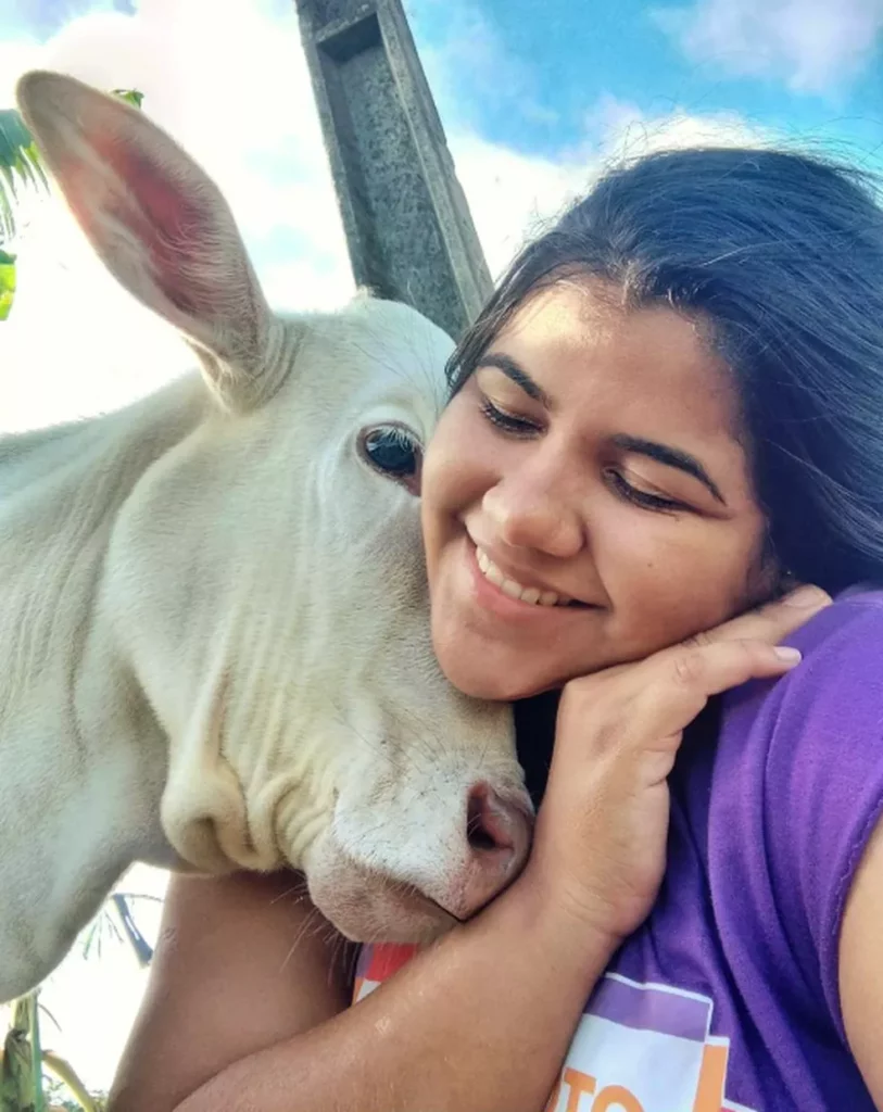 Keterine cria a vaquinha desde muito pequena, depois de salvar a vida dela, porque foi encontrada na colônia de um tio, eles não sabem da mãe. A jovem relata apenas que o animal foi encontrado debilitado e, desde então, ela tem cuidado dela, inclusive, comprou o Caetano para que fizesse companhia e a bezerra não ficasse sozinha.