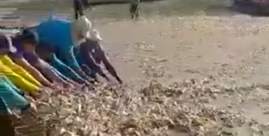 É possível notar no vídeo que ao menos seis pessoas tentam puxar para a beira do rio a rede cheia de peixe. “Obrigado meu Deus”, grita um dos pescadores, agradecendo pela fartura.