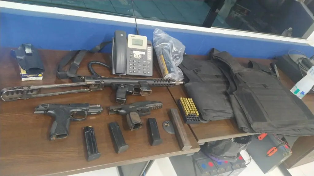 Durante revista minuciosa, as equipes encontraram várias armas de grosso calibre. 1 pistola Beretta Holding 9mm, 01 pistola SIG Sauer 9mm, 01 Submetralhadora ASTAR 9mm, 53 munições 9mm, 02 coletes balísticos e 04 carregadores de munição.