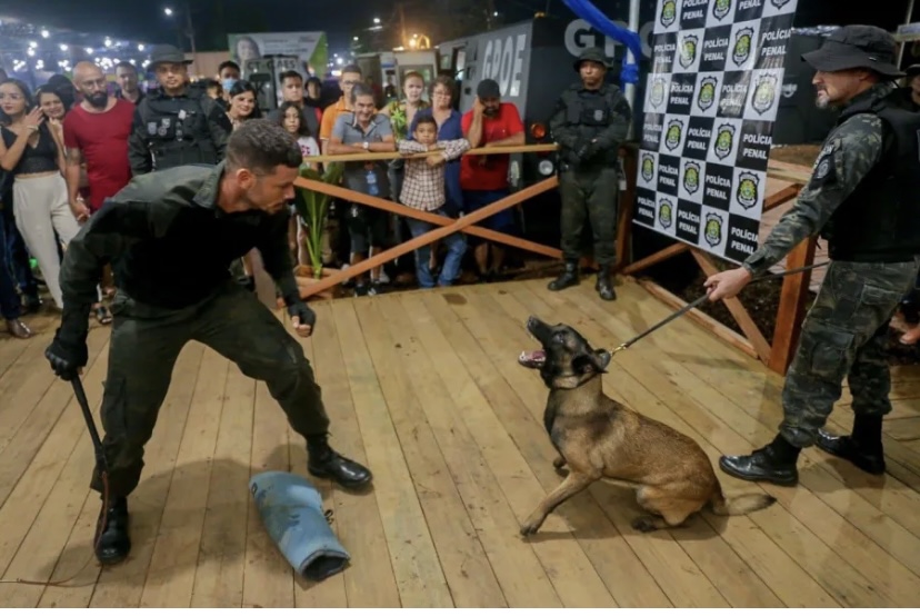 Um grande público se reuniu no estande do Instituto de Administração Penitenciária do Acre (lapen), na noite da quinta-feira, 5, para ver a apresentação dos cães farejadores.