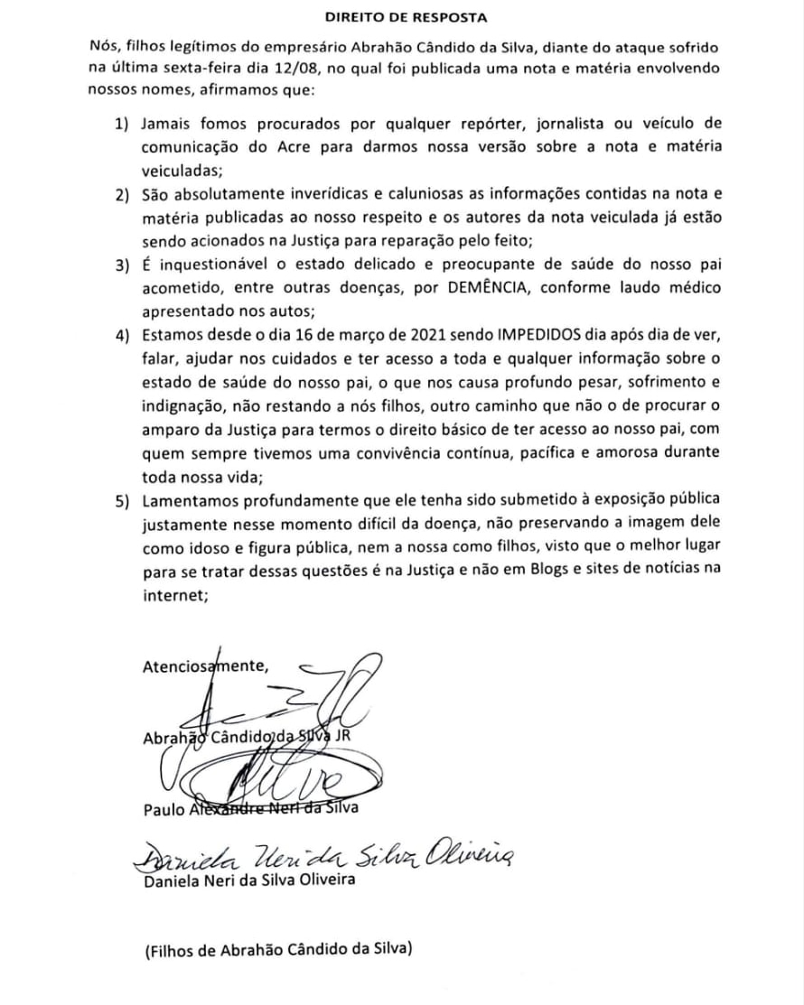 Em resposta as acusações, três filhos do empresário, Abrahão Cândido da Silva Junior, Paulo Alexandre Neri da Silva e Daniela Neri da Silva Oliveira, divulgaram uma nota informando que as informações contidas na nota são “inverídicas e caluniosas”.