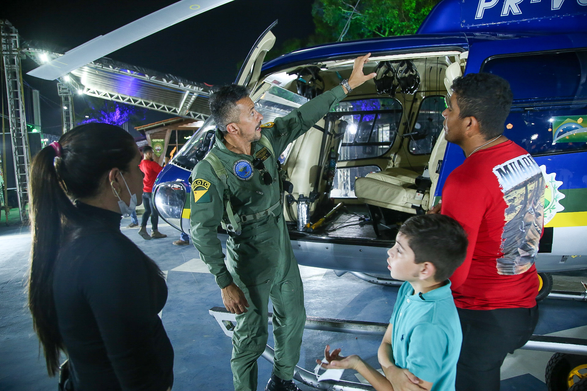 Pela primeira vez na Expoacre, o Centro Integrado de Operações Aéreas do Acre (Ciopaer/Ac) expõe um helicóptero na feira. Muitas crianças e adultos fazem fila para tirar foto próximo da aeronave.