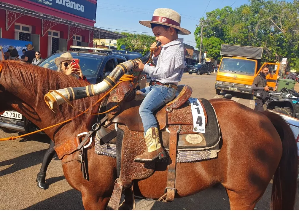 Menino de 4 anos chama atenção ao tocar berrante durante Expoacre: ‘só pode ser dom’, diz mãe