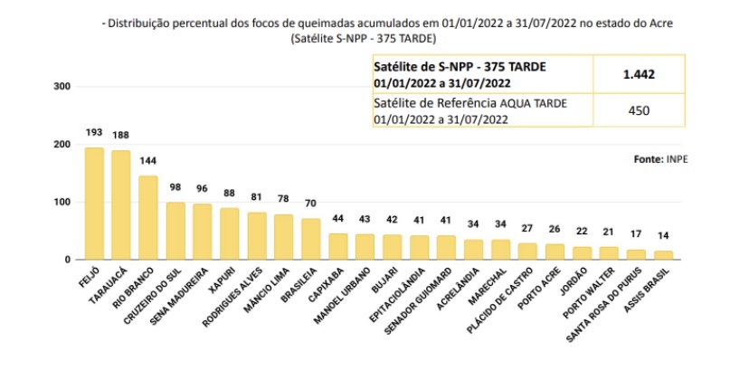O município de Feijó registrou 13,38% desses focos, com total de 193 focos. Em seguida vem Tarauacá com 188 focos -ou 13,04% do total – e Rio Branco (9,9%) com 144 focos.