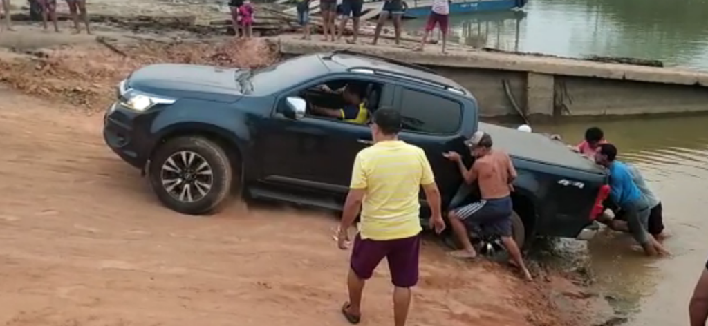 De acordo com vídeos que circulam nas redes sociais, uma caminhonete modelo S10, encontrou dificuldade em subir a rampa de acesso. O condutor do veículo teve de utilizar umas das ‘balsinhas’ que fazem transporte pelo rio, pois a balsa grande que é cedida pelo governo do Estado não estava funcionando.