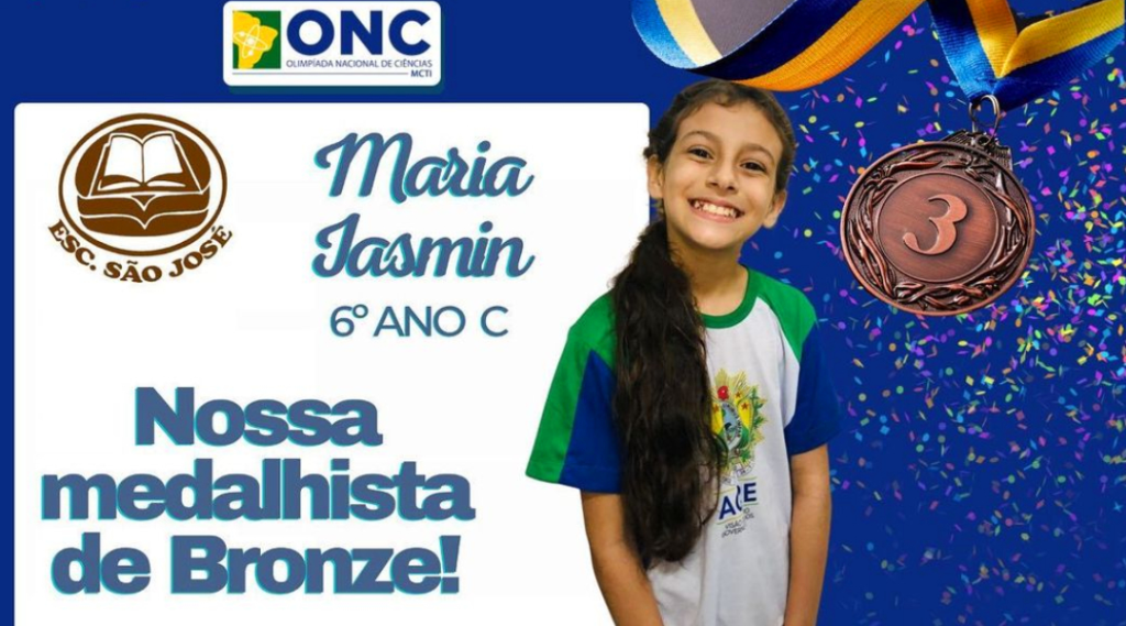 Em Cruzeiro do Sul, a aluna Maria Iasmin da Luz Almeida de Oliveira, do 6º ano da Escola Estadual de Ensino Fundamental São José, ganhou medalha de bronze na olimpíada, com destaque nacional.