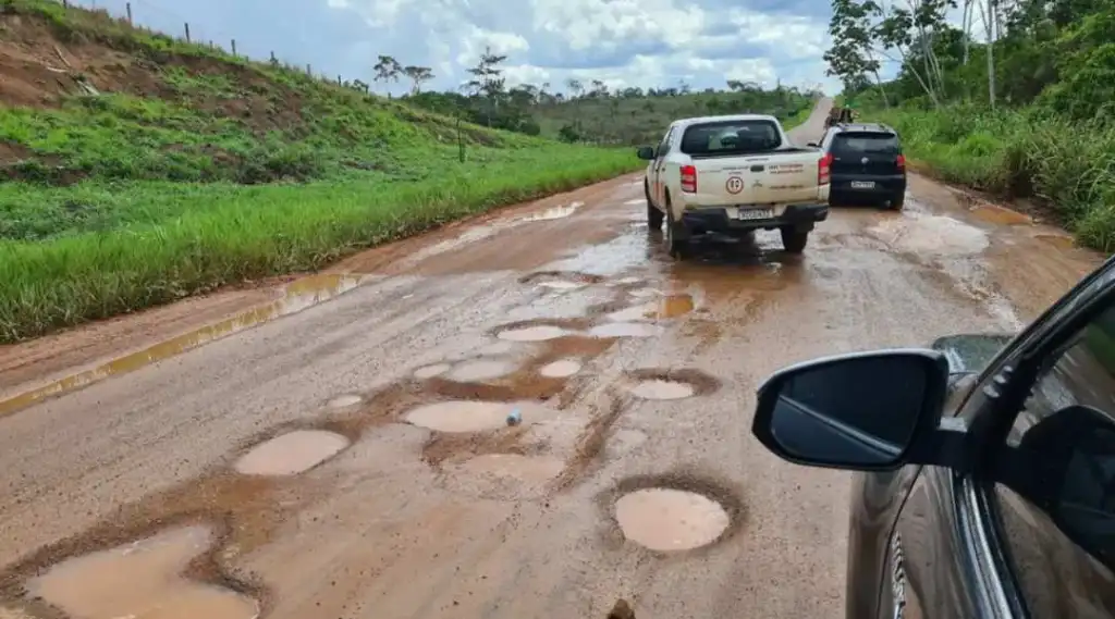 “Percebo que tem partes do asfaltado que acaba cedendo, se não for atento, o motorista não consegue evitar acidente. É a primeira vez que vejo uma estrada tão danificada, mas, muita segurança, cautela e atenção”, destaca.