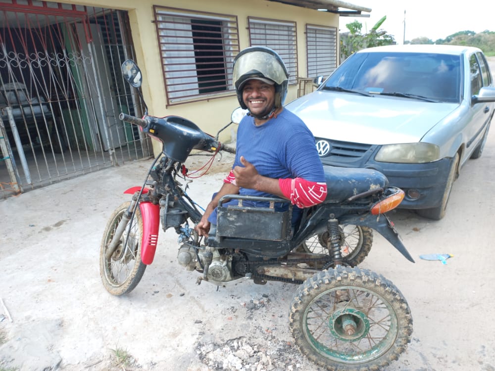 Jaime gosta de andar de moto e fez uma adaptação no veículo para conseguir dirigi-la. Ele tirou a parte traseira da motocicleta e acrescentou duas rodas. “Agora vou para todos os lugares, tenho uma vida normal”, contou.
