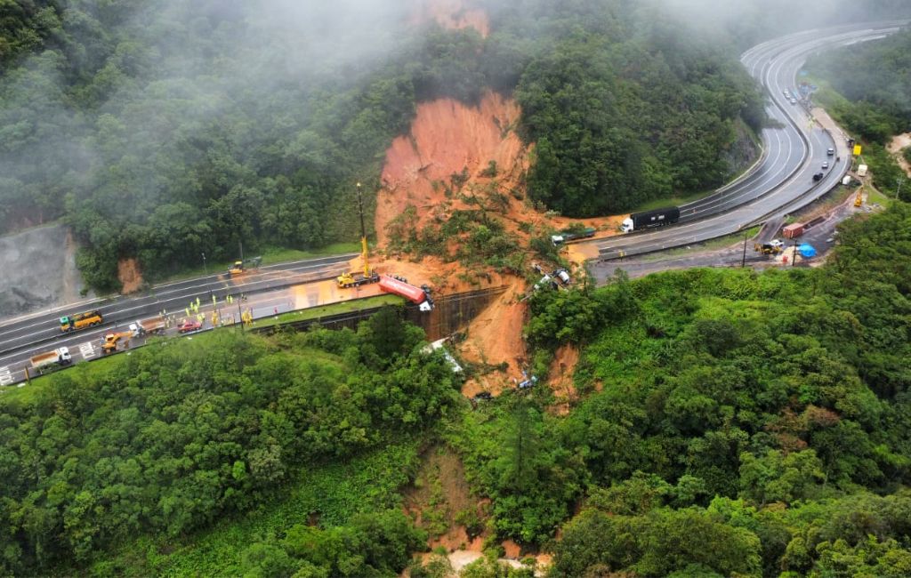 Duas pessoas morreram e seis já foram resgatadas com vida. Ao menos 15 carros e seis caminhões foram carregados pela terra que deslizou sobre a rodovia.
