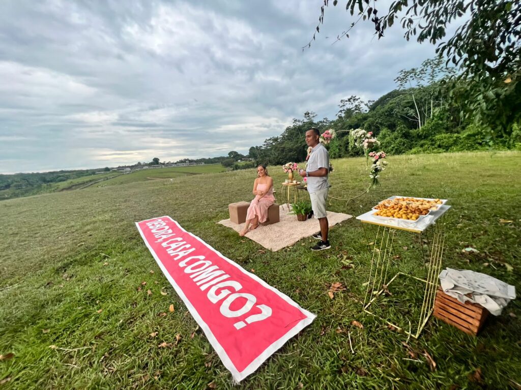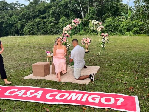 O momento pra lá de romântico foi apreciado por familiares e amigos próximos ao casal. O pedido foi abençoado com um lindo por do sol.