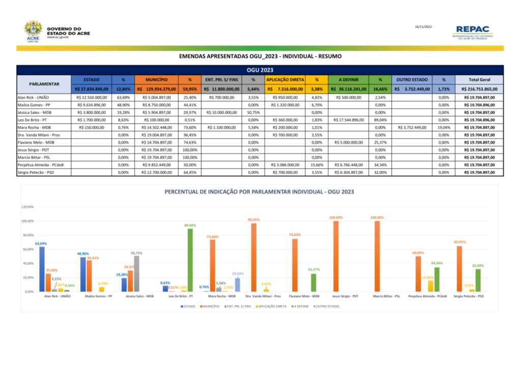 Dos R$ 216,7 milhões de emendas individuais, os parlamentares da banca federal do Acre destinaram R$ 129,9 milhões para os municípios, R$ 11,8 milhões para entidades privadas sem fins lucrativos, R$ 7,3 milhões para aplicação direta por órgãos do governo federal e R$ 36 milhões na modalidade a definir – que deverão ter indicação definida em 2023, porque são as chamadas emendas não carimbadas, são genéricas.