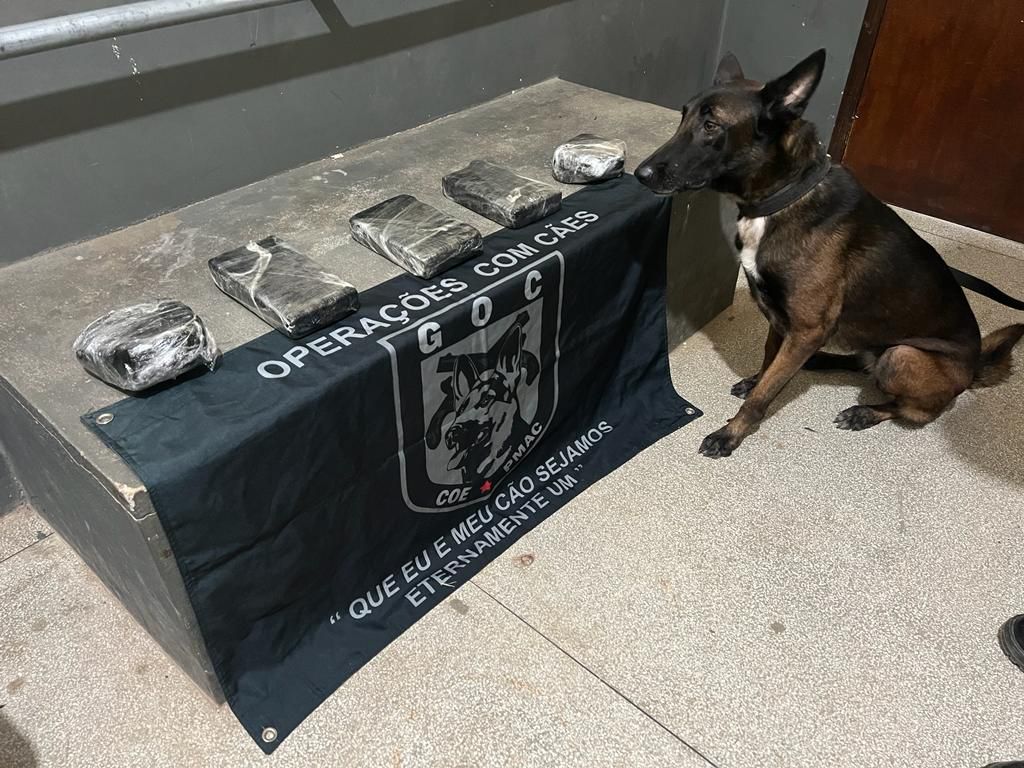Durante uma fiscalização com cão farejador em um ônibus intermunicipal que realizava o trajeto Cruzeiro do Sul/Rio Branco, a cadela Tina indicou algo no compartimento de carga. Após a identificação da proprietária, os militares realizaram uma vistoria na mala, onde foi encontrada pouco mais de 5kg de barras de uma substância com aspecto de cocaína.