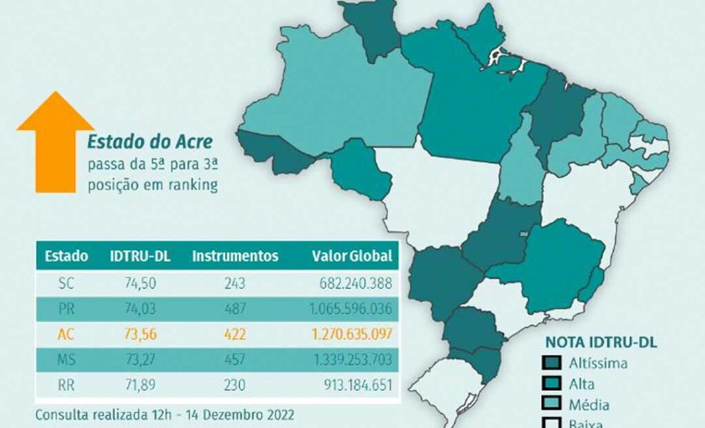 A busca da excelência no uso de recursos públicos é uma característica marcante da atual gestão do governo do Acre. Isso pode ser percebido pela avaliação do Índice de Desempenho na Gestão das Transferências Discricionárias e Legais da União (IDTRU-DL), onde o Acre se destacou mais uma vez, passando, desta vez, da quinta para a terceira posição nacional na atual avaliação do IDTRU-DL, ficando atrás apenas dos estados do Paraná e Santa Catarina, sendo ainda o estado com melhor desempenho entre os sete da Região Norte, com 73,56 pontos.
