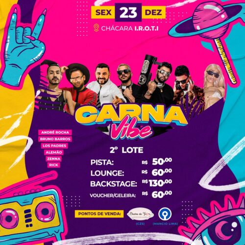 A Unlock Social promoverá o Carnavibe a partir das 20 horas desta sexta-feira (23) em Cruzeiro do Sul. O evento acontecerá na Chácara Iroti e contará com seis atrações, dentre elas, André Rocha, diretamente de Porto Velho; DJ Rick e Lós Padres, de Rio Branco; e DJ Alemão, Zenna e Bruno Barros, artistas locais.