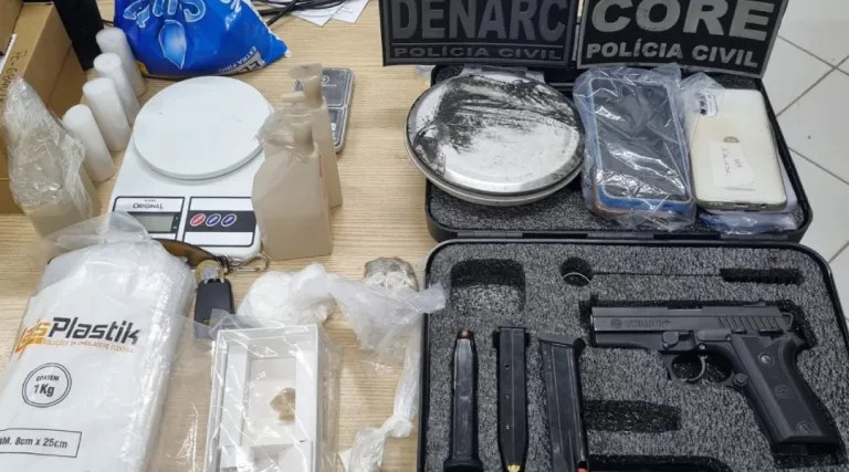A dupla estava em posse de uma arma tipo pistola modelo PT-938, calibre 380, além de 18 munições intactas, 100gm de cloridrato de cocaína e 40gm de maconha.